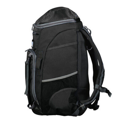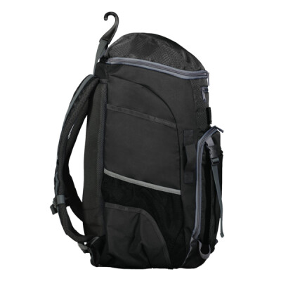 * 600-denier polyester with PVC coating * Matte PVC bottom for durability * Large dual entry main interior compartment with two zipper pulls * Top zippered opening with collapsible shelf for glove ​* Zippered top pocket lined with brushed interior for valuables/small devices * Front zippered pocket for batting gloves etc. * Front helmet flap with adjustable straps​ * Two front webbing loops for additional clips, securing safety gear * Two mesh side water bottle pockets * Full length side bat sleeves (size to fit up to 2 5/8" bat)​ * Hook and loop strip closure for batting gloves * Inside zippered mesh pocket * Collapsible shelf for glove * Padded back for support and comfort * Web handle at top of backpack with fence clip​ with hidden pocket to store away when not in use * Adjustable padded shoulder straps with adjustable sternum strap * 13" W x 21"H x 7" D