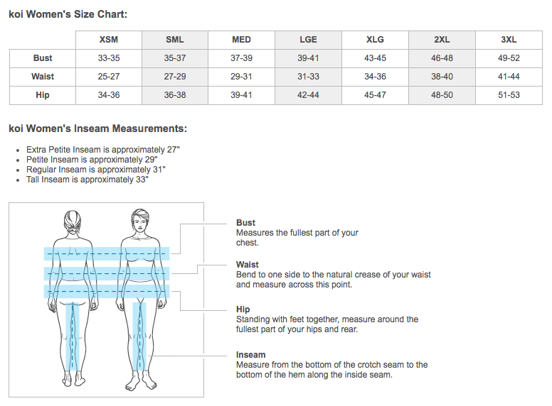 Solid top based on Koi's popular Ashley top. Easy fit pullover styling. Rib-trim at neck and sleeves. Mini chest pocket and two patch pockets. Looks great with Koi's Morgan pant. Center back length: 26".