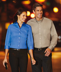 60% cotton/40% polyester • durable baby twill • wrinkle-resistant • double-needle side seams • feminine spread collar • white pearlized buttons • fitted silhouette • Sizes: S-2XL
